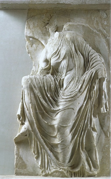 Очень интересна скульптура богини Ники, подвязывающей сандалию. Это прежде всего очень человеческий жест, совсем не божественный. Можно представить, как ее обувь спала на мгновение и теперь она изгибается чтобы подправить. И при чем это движение все равно показано прекрасно, ее тело возможно увидеть даже через складки одеяния. Она предстает очень человечной в этот момент. Скульптор не задумывался будет ли это величественно или нет.