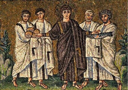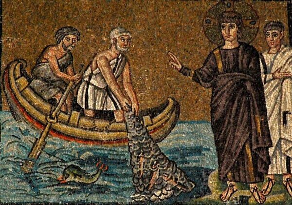 «Чудесный улов», «Чудесное умножение хлебов. Христос благословил пять хлебов и две рыбы», Сант-Аполлинаре-Нуово, базилика в Равенне, конец V — начало VI веков