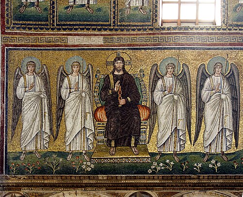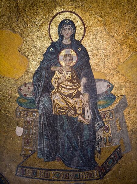 Христос Пантократор, Сант-Аполлинаре-Нуово, базилика в Равенне, конец V — начало VI веков // Мозаика «Богоматерь на троне», Собор Святой Софии — Премудрости Божией, Константинополь, IX век