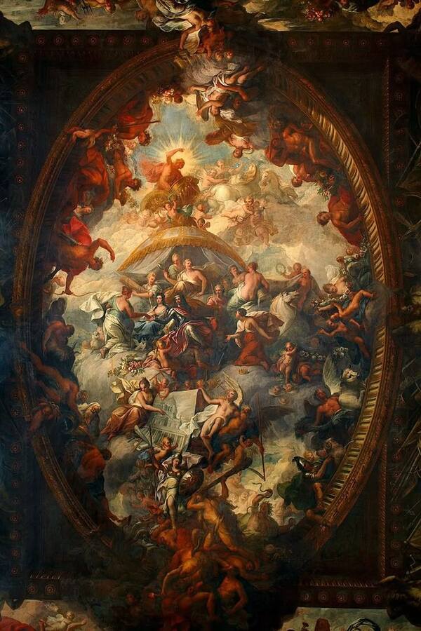 Художник тщательно выстраивает перспективу так, чтобы с одной точки обзора возникла полная иллюзия разверстого неба. Движение здесь имеет четкое направление — снизу вверх, от земного к небесному. Фигуры святых и ангелов расположены по спирали, создающей эффект бесконечного.