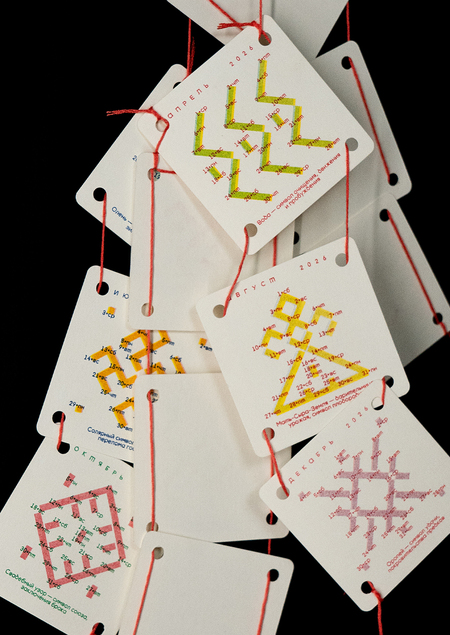 Календарь основан на технике ткачества поясов на дощечках — традиционном способе создания поясов, где через пересечение нитей рождается орнамент. Каждая карточка-месяц повторяет форму дощечки и содержит свой орнамент с символическим значением. Эти узоры несут обережные смыслы и отражают природные и жизненные циклы года.