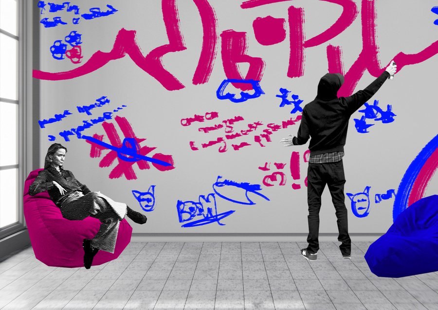 промт для постеров: An art studio poster depicting people engaged in creative activities. The scene features hands and bodies in motion, drawing on paper, using brushes, or applying spray paint. The poster features natural lighting, art objects, abstract artwork, and textured walls. Add the word «art studio» written in oil crayon in the corner of the poster. (промт я прогнала два раза для серии)