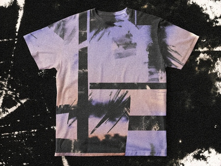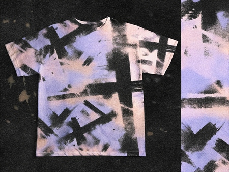 промт футболок: Mockup of t-shirt on a black background. The t-shirt should be completely covered with abstract brush strokes, textures, noise, blur, and gradients (промт прогнала 2 раза для серии)
