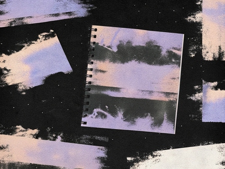 промт для скетчбука: Mockup of sketchbook on a black background. Sketchbook should be completely covered with an abstract brushstroke print, textures, noise, blur, and gradients as a pattern