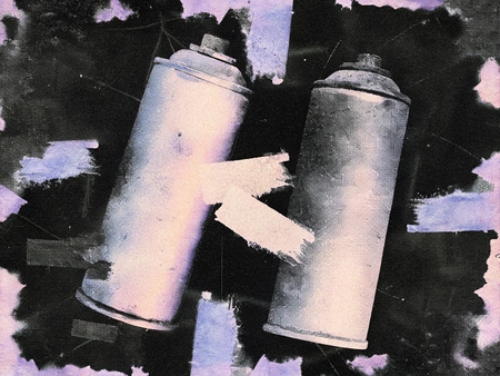 промт для баллончиков краски: Mockup of two spray can for graffiti painting on a black background. They should be completely covered with an abstract brushstroke print, textures, noise, blur, and gradients as a pattern