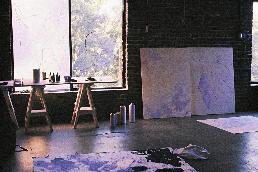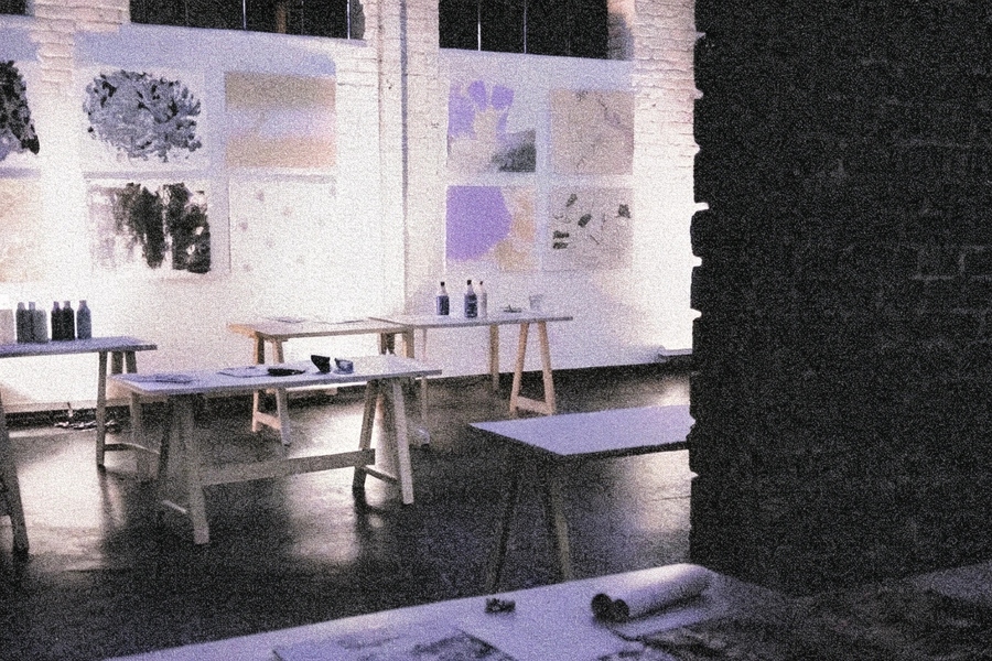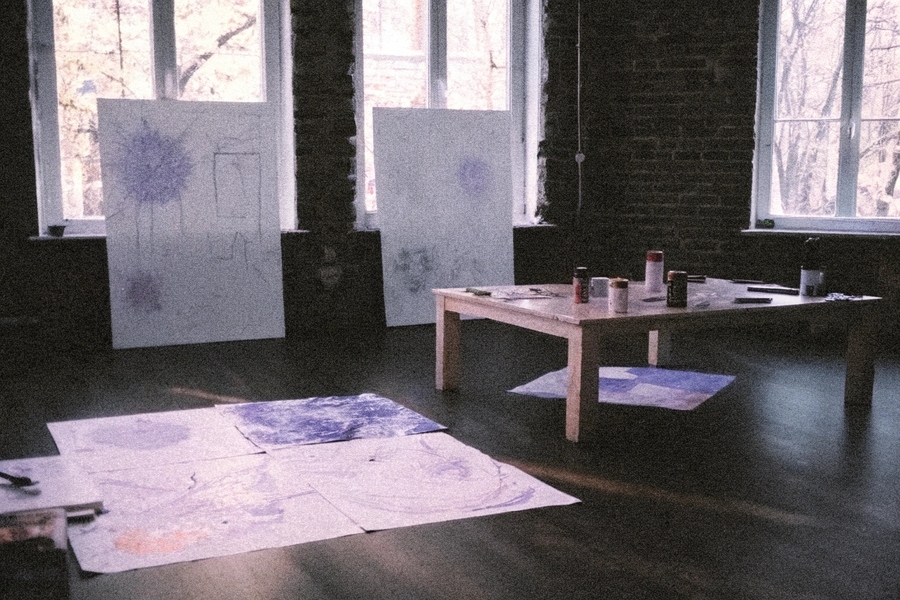 промт для пространства: A cozy interior of a modern art studio with warm natural lighting and pastel colors. The large brick or plastered walls are partially covered with abstract art posters, sketches, and paint splatters. The wooden tables are naturally arranged with brushes, paints, spray cans, paper rolls, and art supplies. There are traces of paint on the floor. The lighting is diffused. High-quality realistic photography, cinematic depth of field, and artistic composition. (промт я прогнала 4 раза для серии)