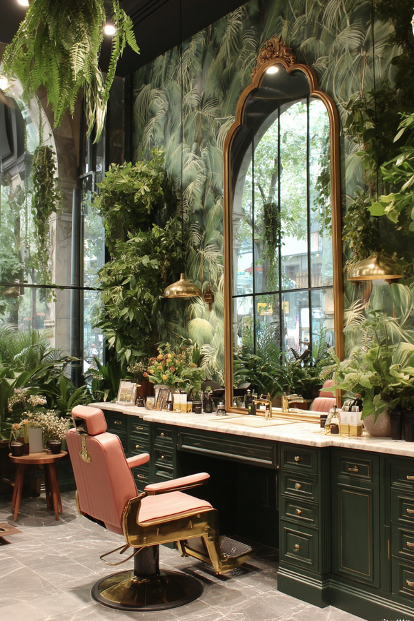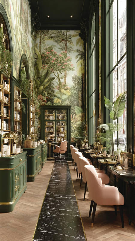 the luxurious appearance of the beauty salon, the two-story, elegant dark facade, floor-to-ceiling panoramic glass windows, matte black and dark green tones, pink and gold accents, tropical style, modern architectural style using natural textures such as dark stone and wood, soft lighting, stylish design. jungle-style decor, exclusive and high-end appearance, focused only on the exterior architecture, inside you can see the working barber area. there is no text --chaos 20 --ar 77:58 --raw --sref https://s.mj.run/gmwSSJynRqE https://s.mj.run/Kbyj4Fy01mE https://s.mj.run/2TnJ5BebiRU --stylize 150