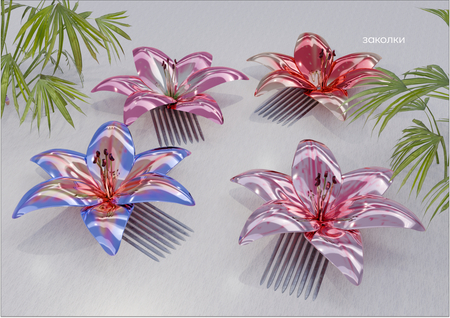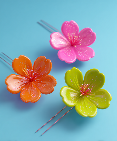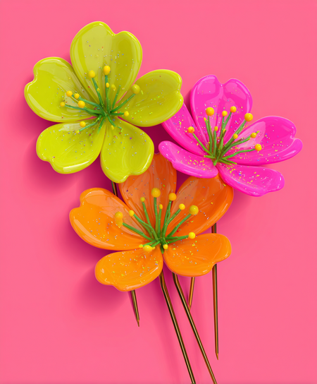 3D cartoon jungle flower hairpins, stylized and playful design, large soft petals, bold colors (electric pink, lime green, sunset orange), kawaii-inspired finish, small sparkles or gloss, isolated on bright background, minimal shading, suitable for stylized Blender modeling --chaos 10 --ar 5:6 --raw