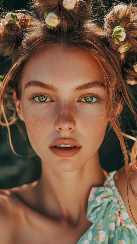 1. the Brazilian woman depicted in ¾ of the picture above is looking at the camera, professional shooting, blurred tropical dark background with flowers, smooth skin, super realistic photo, she has brown hair and green eyes, a lot of bunches on her head 16 pieces, stylish hairstyle from a beauty salon, super realistic photo --chaos 5 --ar 2:3 --raw --v reference: https://s.mj.run/f8gyn-mNr7Q 2. a fashionable photo of an energetic model with light brown hair gathered in small buns, 16 pieces of them all over her head and green eyes, dressed in a sundress, her bunches on her head are not made of hair, but flower buds instead, a photo in ultra HD 8k resolution, high contrast, a photo for a Gucci editorial photo shoot, fish eye angle, Close-up view of the face from above --chaos 5 --ar 9:16 --raw --v 6.1