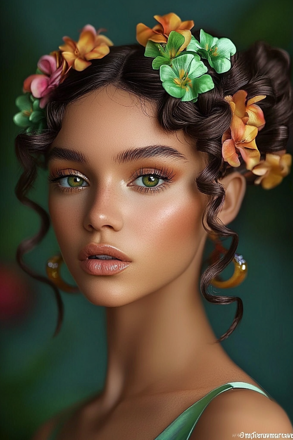 the Brazilian woman depicted in ¾ of the photo looks up at the camera, professional shooting, good sunlight, tropical dark background with flowers, glassy skin, brown hair and green eyes, lots of bunches on her head — 16 pieces, stylish hairstyle from a beauty salon, super realistic photography --chaos 5 --ar 2:3 --raw --v 6.1 reference https://s.mj.run/Q0KmggMSMQQ