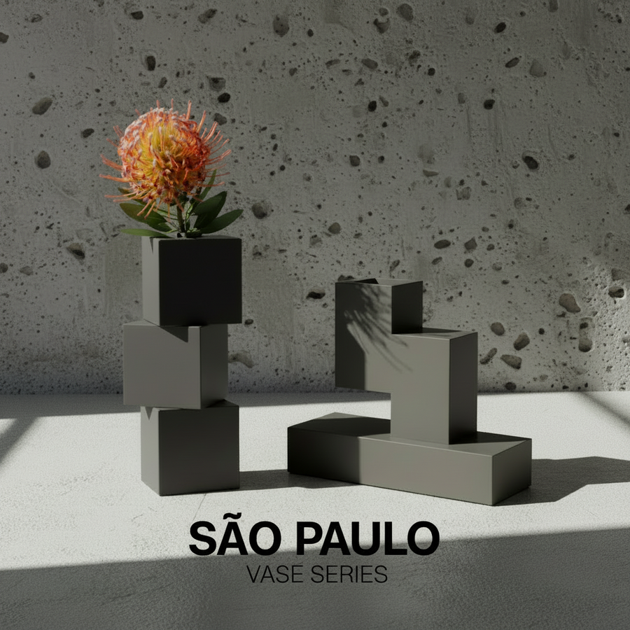 Серия ваз «Сан-Паулу» вдохновлена эко-брутализмом Латинской Америки и городской средой одноимённого мегаполиса, где массивная бетонная архитектура сосуществует с активной тропической растительностью. Геометрически строгие формы ваз, собранные из простых прямолинейных блоков, отсылают к бруталистским фасадам и конструкциям, а продуманная асимметрия объёмов напоминает о сложной структуре городских кварталов. Использование современных технологий 3D‑печати позволяет получать поверхности с разной степенью шероховатости, что подчёркивает технический характер объектов и их связь с индустриальной эстетикой.