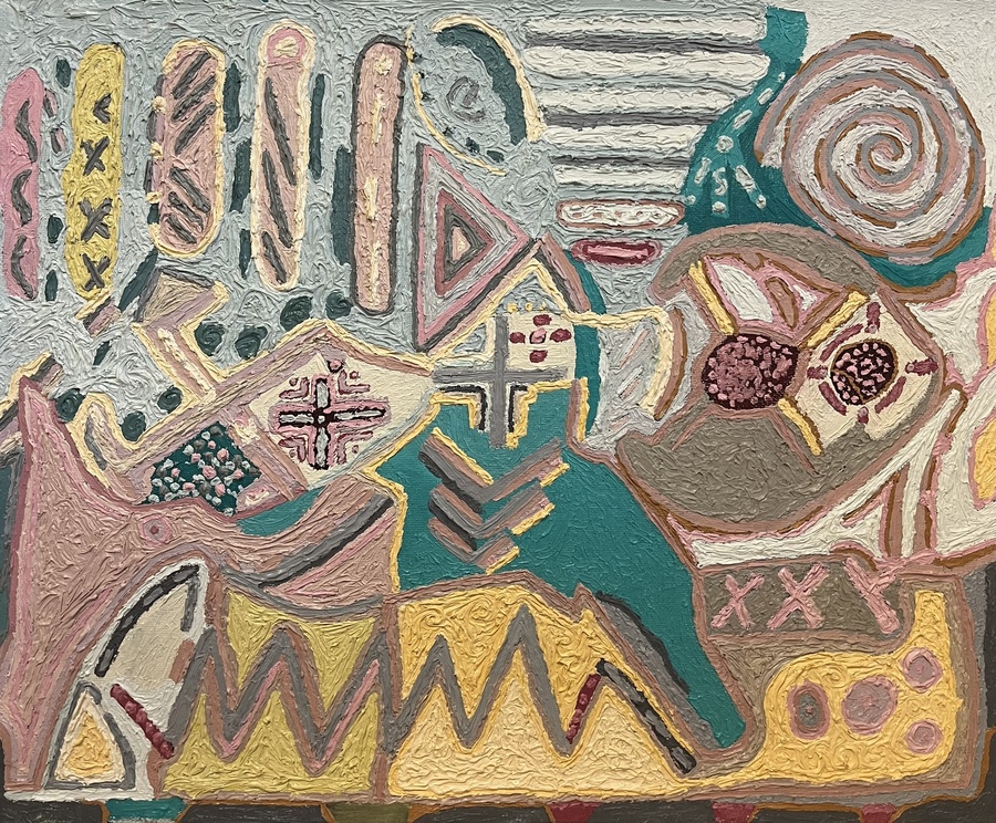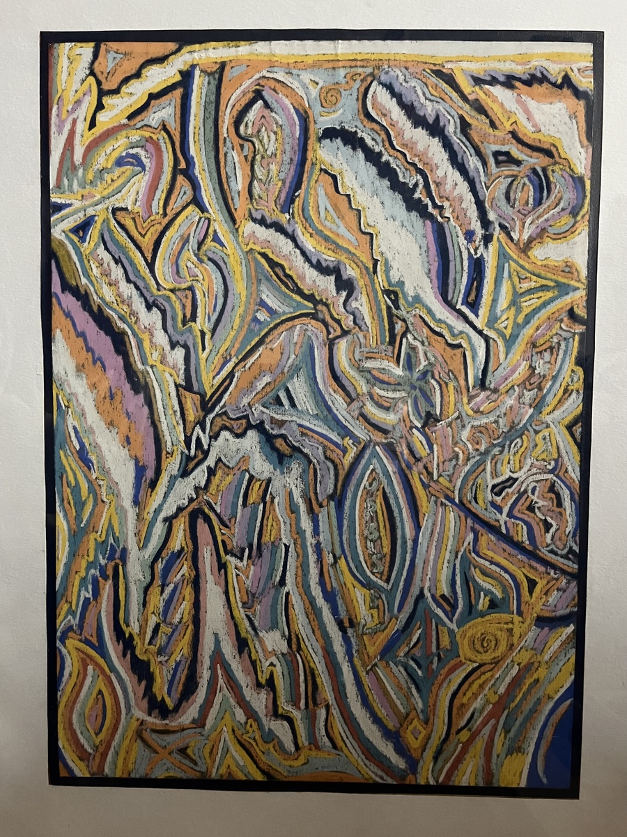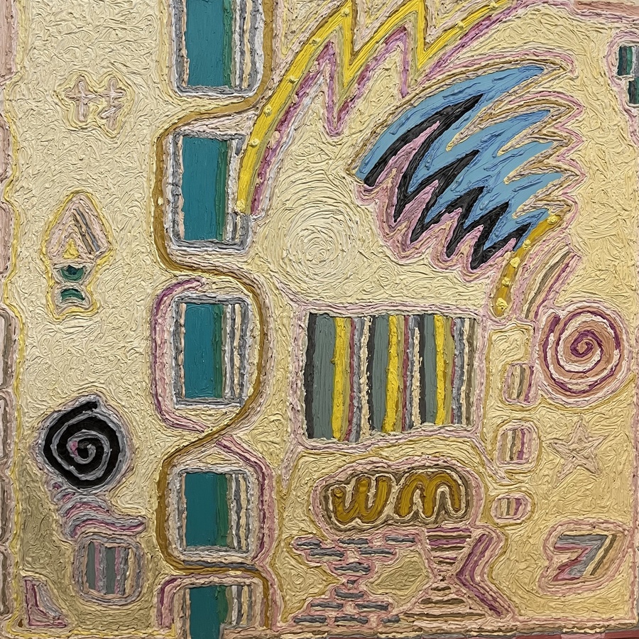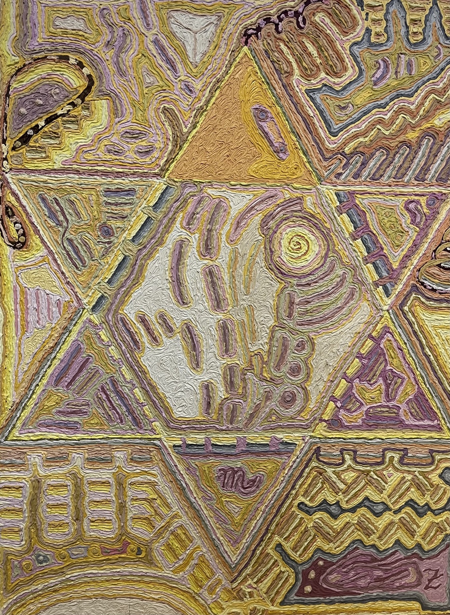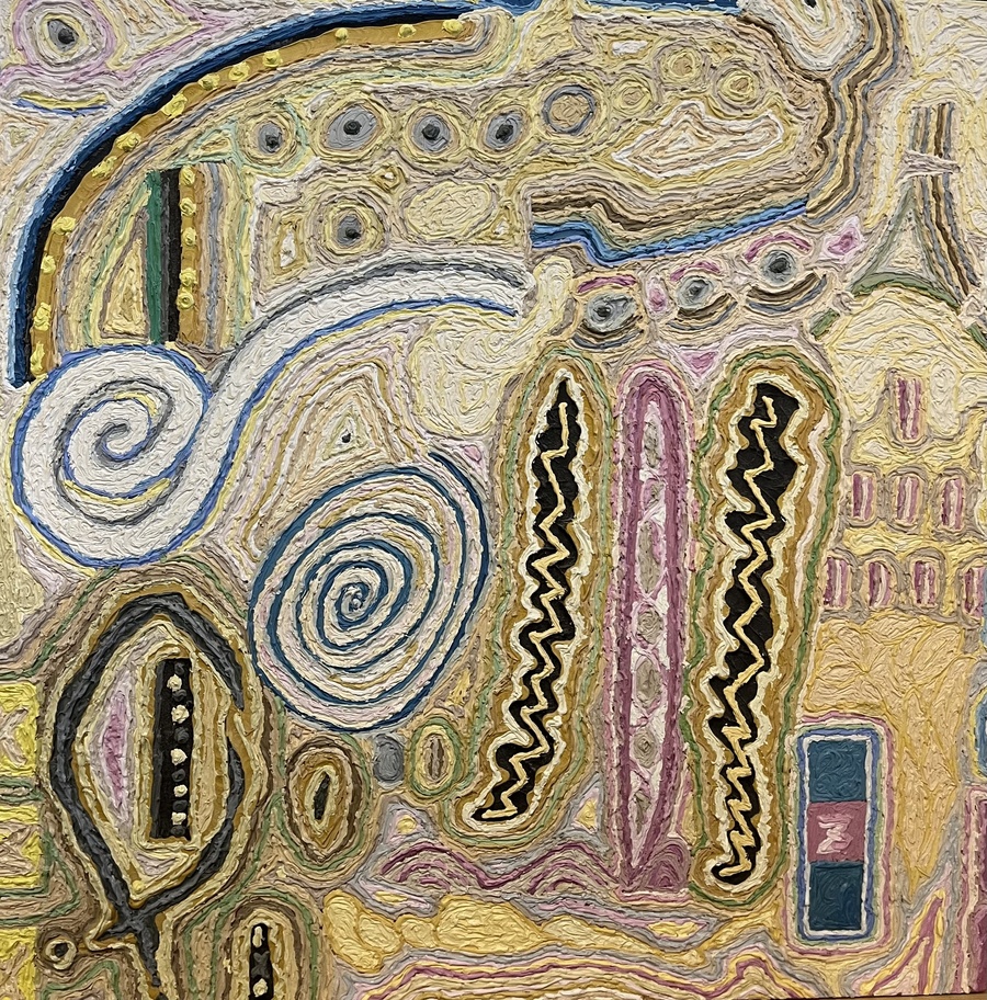 Внешне — это обычные мазки на холсте, но при ближайшем рассмотрении они оказываются мелкими спиралями, которые автор тщательно выкладывал тонкой палочкой. Каждая деталь в его работах — цвет, фигуры, символы — имеет для автора глубокий смысл.