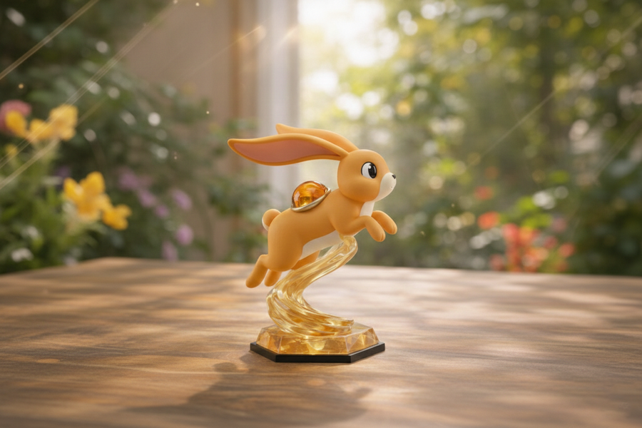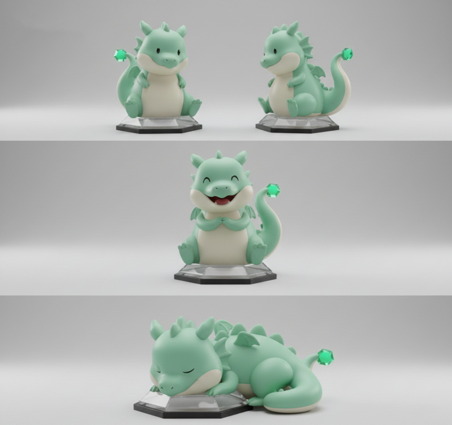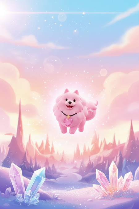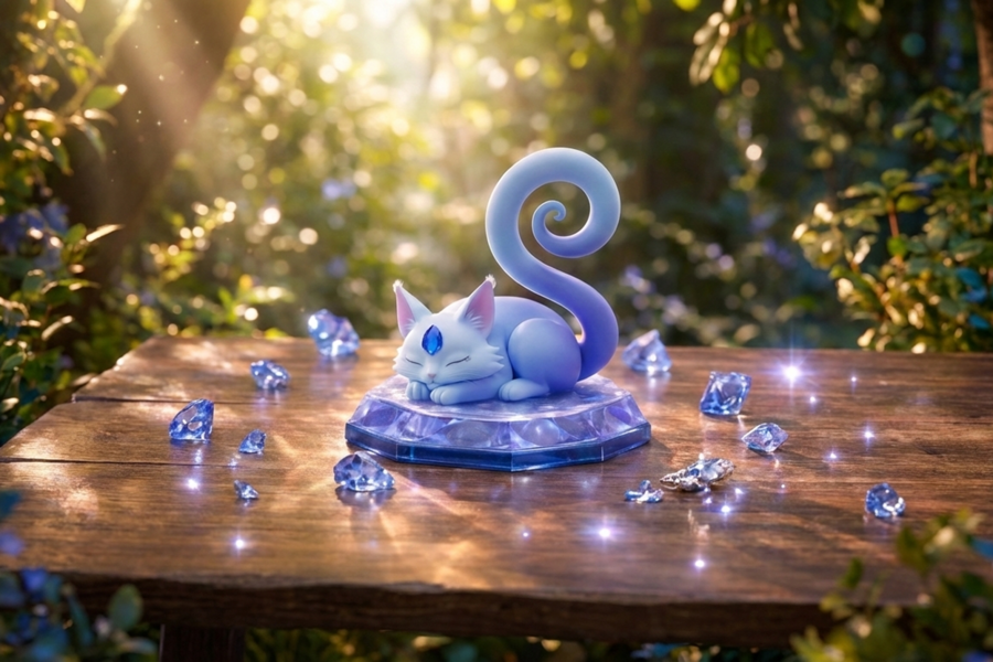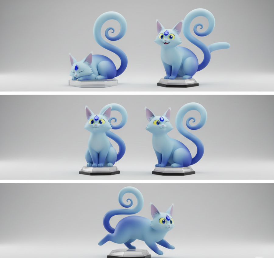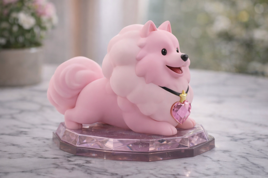 Фигурки выполнены в мягком, обтекаемом 3D-стиле с использованием пастельных градиентов и матовых текстур, а их основанием служит граненая подставка из «живого» кристалла, гармонирующая с камнем самого питомца.