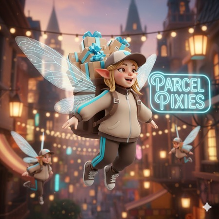 stylized semi-realistic 3D character, consistent art style across entire series, realistic proportions with slight exaggeration, clean readable silhouette, PBR textures, soft neutral color palette with one accent color, modern everyday clothing, fantasy race in contemporary life, full body, centered, neutral A-pose, studio background, soft global illumination, high detail sculpt, clean topology, game-ready, no extreme poses, no dramatic lighting, Tiny fairy 3D character delivery person, small stature, backpack filled with parcels, cheerful expression, dynamic pose, high-detail 3D model