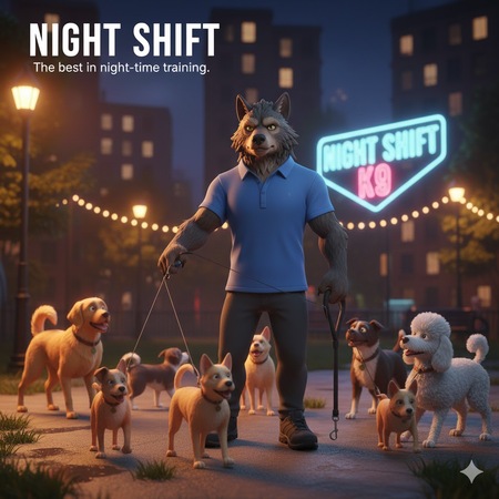 stylized semi-realistic 3D character, consistent art style across entire series, realistic proportions with slight exaggeration, clean readable silhouette, PBR textures, soft neutral color palette with one accent color, modern everyday clothing, fantasy race in contemporary life, full body, centered, neutral A-pose, studio background, soft global illumination, high detail sculpt, clean topology, game-ready, no extreme poses, no dramatic lighting, werewolf dog trainer, anthropomorphic wolf form, sporty casual clothing, holding leash, calm professional demeanor