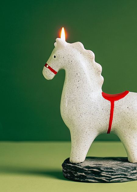 Проект представляет собой серию изображений новогодних свечей, выполненных в едином визуальном стиле с использованием насыщенной, яркой цветовой палитры и выразительных контрастов. Основная идея проекта — передать атмосферу праздника, радости и сказочного настроения через необычные формы свечей и смелые цветовые решения. В качестве образов используются узнаваемые новогодние символы, переосмысленные в декоративных формах: свечи в виде лошади, смотрового колеса, ёлочек и других праздничных фигур.