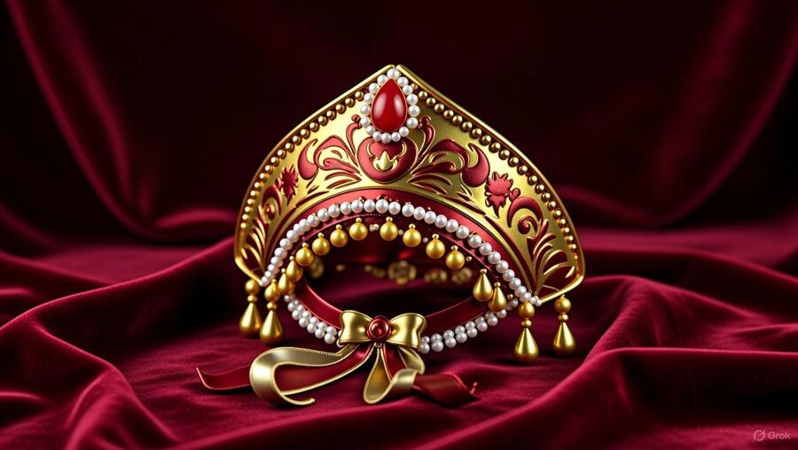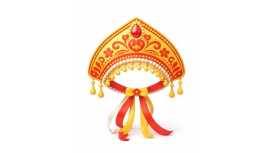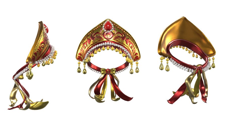 5. Кокошник Материал: SLA-печать с последующей ручной отделкой под фарфор и перламутр Высота: ~90 мм Ширина: ~ 80 мм Толщина стенок: ≥2,5 мм Цвета: золотистый цвет основы, прорисовка деталей с использованием красного/серебряного Поверхность: гладкая, имитация фарфоровой елочной игрушки Крепление: опоры древообразные