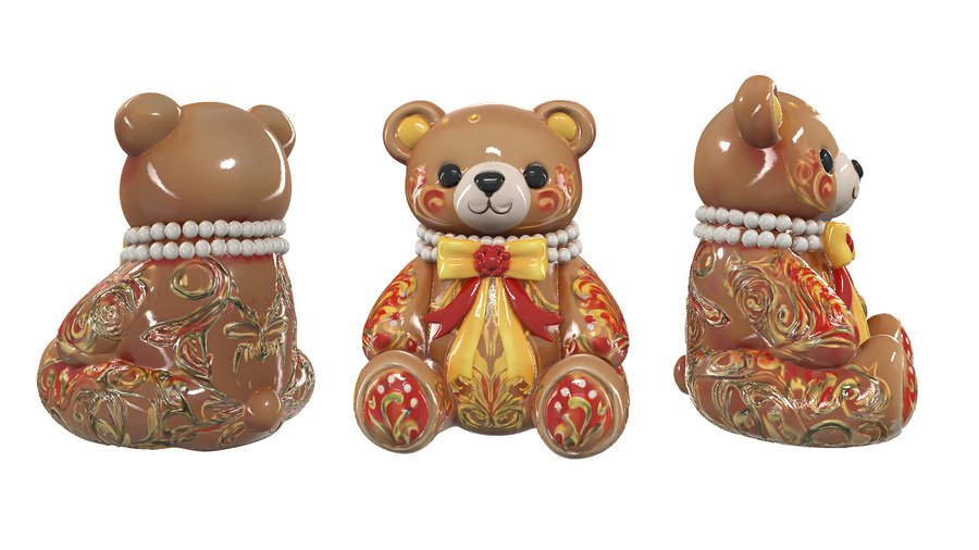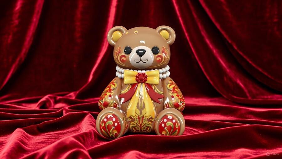Фигурки выполнены в яркой, глянцевой, новогодней эстетике с активным использованием золота, эмалевых поверхностей и декоративных акцентов. Росписи и орнаменты заимствованы из хохломы, но интерпретированы современно: узоры становятся более графичными, насыщенными и подчёркивают объём формы. Золото здесь символизирует не только богатство и торжественность, но и нарочитую театральность образа.