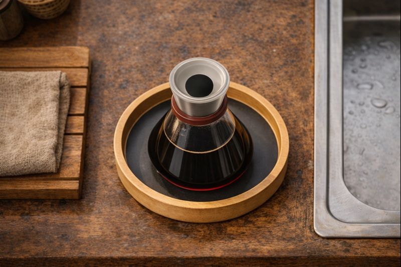 Соусница RIN построена вокруг одного акцента — красного кольца-уплотнителя, которое фиксирует верхний модуль и задаёт ритуал использования: «открыл — налил — закрыл». Конусная стеклянная колба показывает уровень соуса, металл собирает форму в чистый силуэт, а деревянный поднос держит предмет как отдельный «остров» на столе и предотвращает следы от капель.