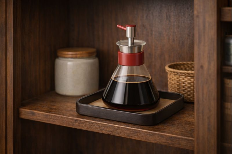 SEN — компактная соусница с рычажным механизмом, превращающая налив в контролируемое действие. Верхний модуль работает как клапан: дозирует соус и помогает избежать подтёков после использования. Квадратный поднос фиксирует предмет на полке/столе и собирает возможные капли, сохраняя поверхность чистой.