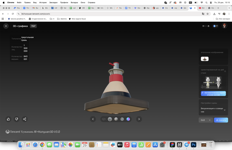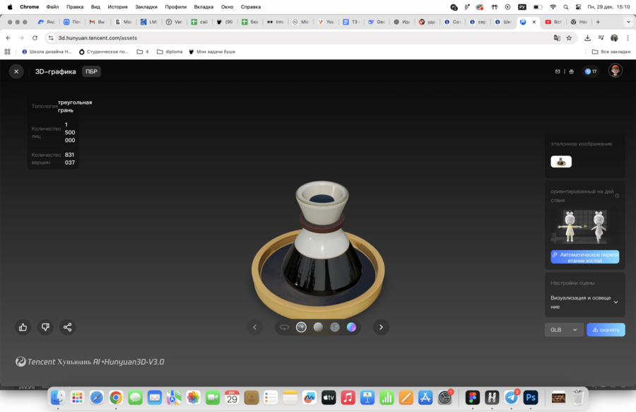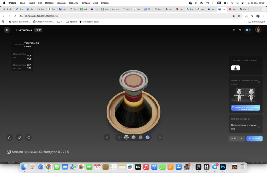 Дальше я перешла к 3D-части. По комментариям преподавателя можно было использовать сервисы генерации 3D-моделей, поэтому я подготовила изображения-референсы (несколько ракурсов) и загрузила их в https://3d.hunyuan.tencent.com/ для получения основы модели. Для текстового контроля результата я использовала тот же смысловой промпт и обязательные запреты на носик. После генерации я сделала скриншоты модели минимум с 4 ракурсов (hero ¾, боковой вид, вид сверху, back ¾) и оформила их как «слайдер» при загрузке в задание.
