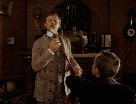 Последний существует в этой кинокартине также и для комических ситуаций. Например, в сцене, когда Шерлок еще не раскрыл свою маскировку старика, Ватсон представляется ему Шерлоком Холмсом, на что настоящий сыщик отвечает: «Ну тогда я, наверное, Ватсон».