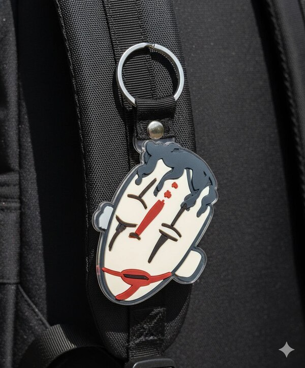 Please create a detailed design of a keychain based on the provided image. The keychain should look like it is hanging on a backpack strap. Focus on making the keychain visually appealing and practical, with clear outlines and suitable proportions. The background should suggest the keychain is attached to a backpack, with some texture or fabric visible. Use bright colors and ensure the design reflects the original image’s style and details.