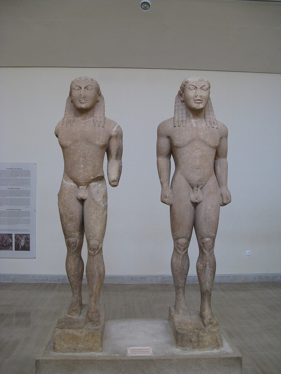 курос — (стоящий обнажённый юноша) ко́ра — (стоящая задрапированная девушка).