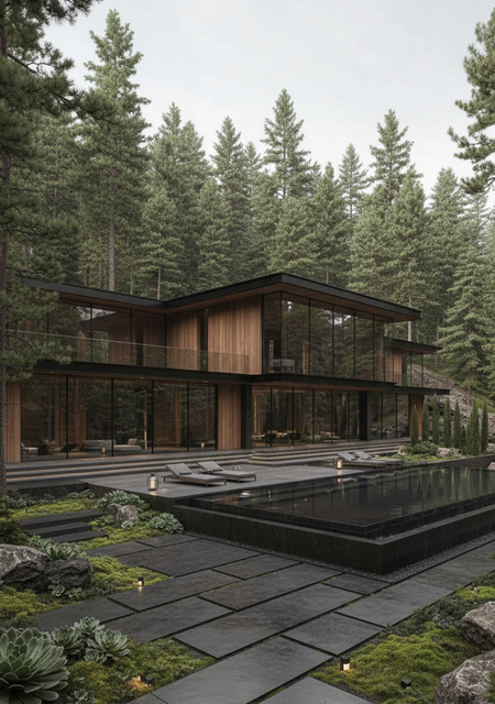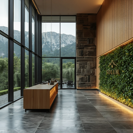 промт для зоны ресепшен: Luxury spa reception area, architectural photography, eco-minimalist design, massive windows with mountain view, light oak wood reception desk, stone floor, green wall with living plants, warm ambient lighting, serene atmosphere, no people.