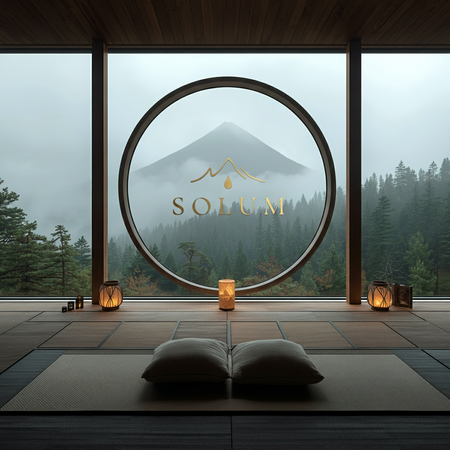 промт для медитационной зоны: Zen meditation space in mountain spa, sunken floor with tatami mats, circular window framing mountain peak, minimalist decor, paper lanterns, incense, floor cushions, panoramic forest view, soft fog, tranquil.