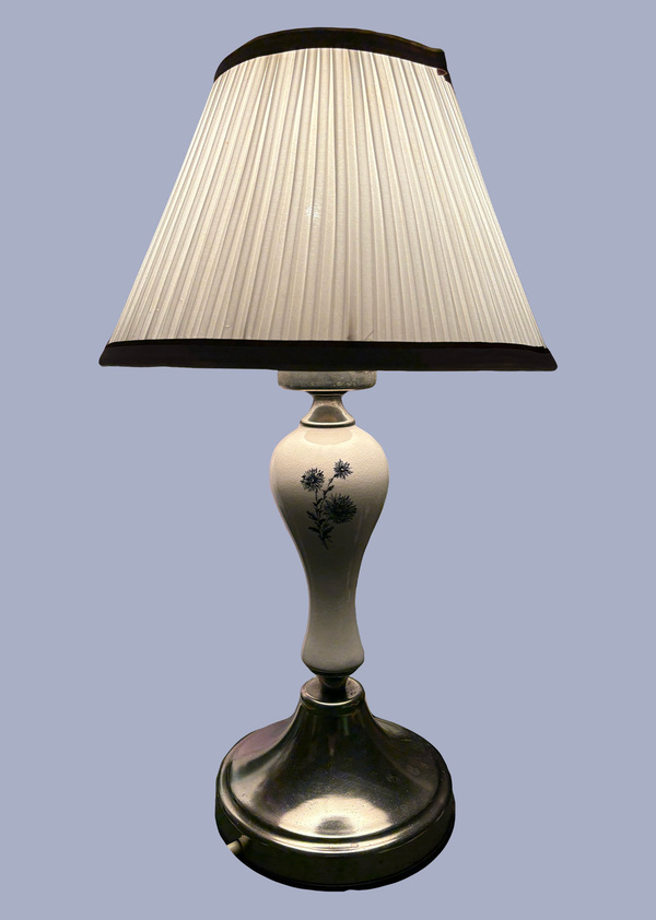 Её металлическая основа выглядит прочно и устойчиво, обеспечивая надежную опору и долговечность конструкции. В середине ножки расположена керамическая вставка с трещинками в технике кракле, которая придаёт лампе уютный, домашний характер. Поверхность керамики украшена голубыми цветами, напоминающими васильки — популярный декоративный мотив конца 1980-х годов. Белый текстильный абажур смягчает свет, создавая тёплую, рассеянную атмосферу, которая делает лампу не только источником света, но и элементом уюта и комфорта.