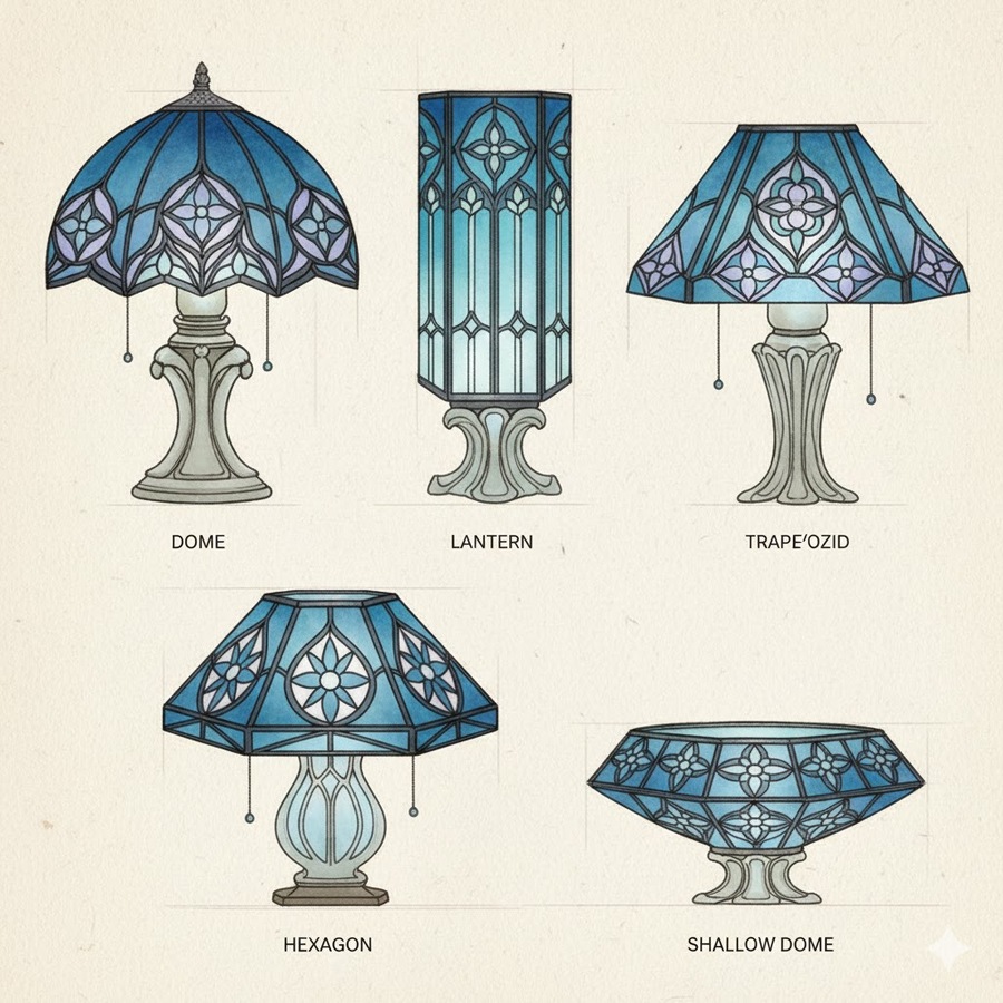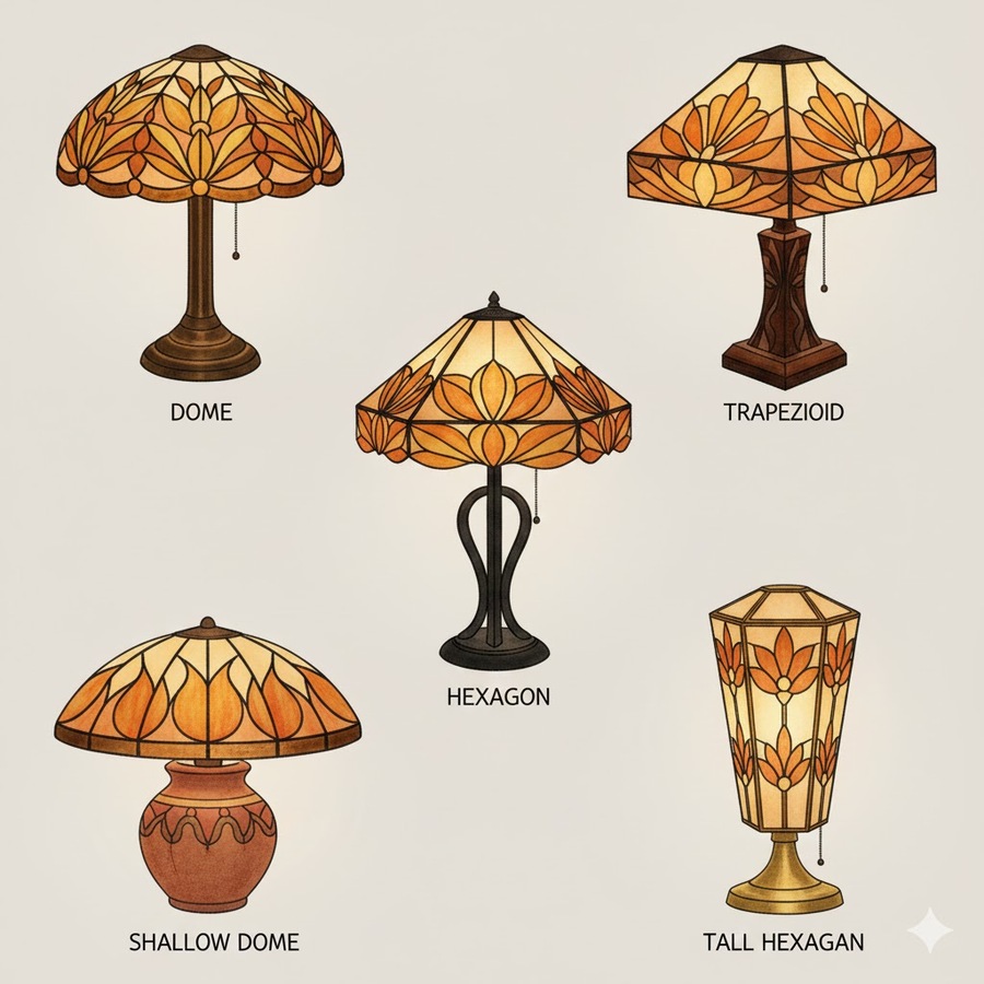 concept sheet of stained-glass table lamps, 5 variations, warm amber and orange palette, geometric floral patterns, various lampshade shapes — dome, trapezoid, hexagon, clean line art, soft watercolor shading, all designs on one page, neutral background