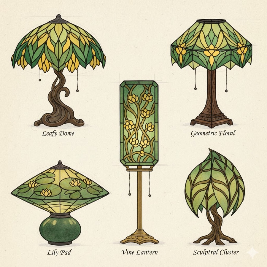 stained-glass lamp concept sheet, 5 designs inspired by leaves and flowers, green and yellow palette, rounded and angular shades, line-art + soft color fills, shown together on one page