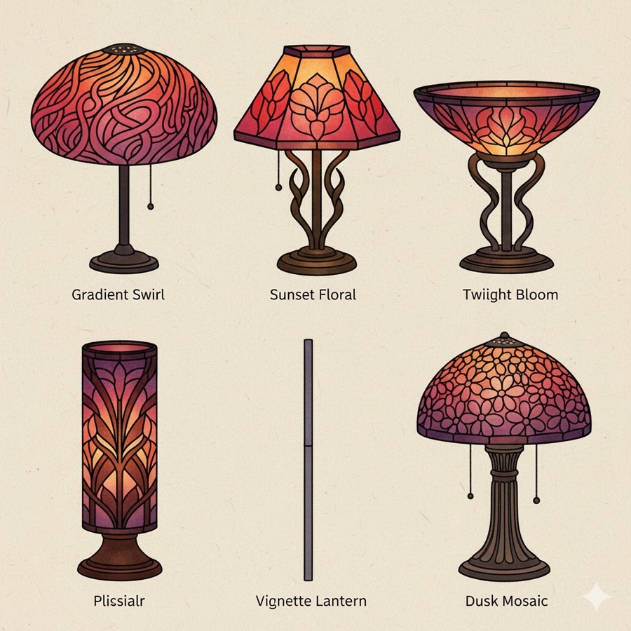 sunset-colored stained-glass lamp designs, sheet with 4–5 variations, gradients from orange to violet, floral and abstract motifs, dome and tapered shapes, arranged neatly on one page