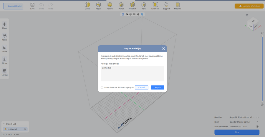 В процессе загрузки 3D-модели в программное обеспечение Anycubic Photon Workshop, используемое для подготовки к 3D-печати, была обнаружена ошибка. Для устранения данной проблемы была применена функция восстановления (repair), после чего модель была успешно подготовлена к печати.