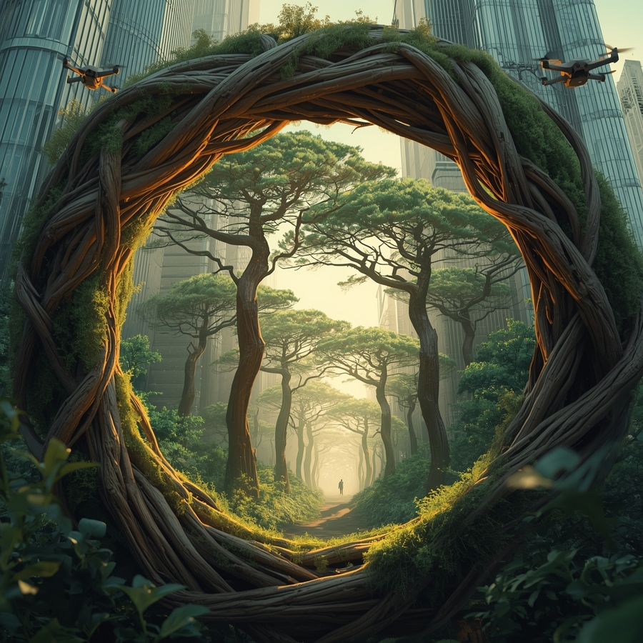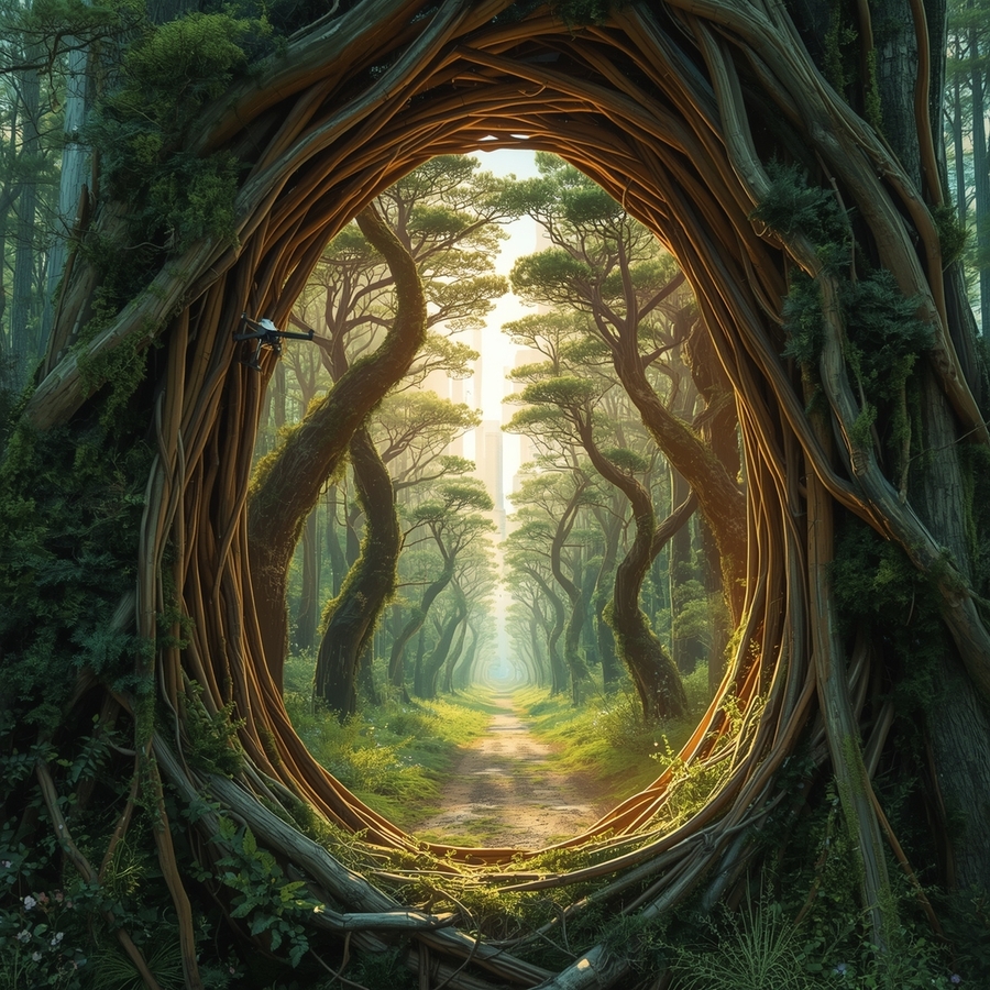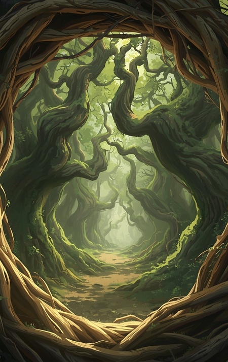 1. Leonardo.ai Промпт: A mystical wooden frame made from intertwined forest branches, forming a natural arch like a window. Inside the frame is a vivid reflection in the mirror of the Dancing Forest — twisted pine trees forming elegant spirals, covered in soft green moss, light mist in the air, forest path leading inside, depth and perspective. Cinematic lighting, painterly illustration, warm green tones, realistic texture, detailed shadows, fantasy atmosphere, by John Bauer and Alexandra Exter, highly detailed, 8k, depth of field.