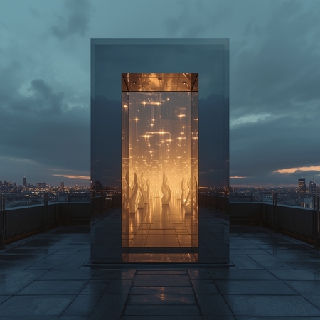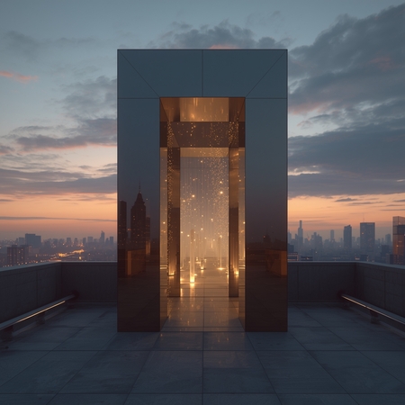 2.Leonardo.ai Промпт: a large monolithic mirror standing on the rooftop of a modern city building at dusk. The mirror behaves like a reflective portal — not transparent. In its reflection, a mesmerizing, mystical world appears — an otherworldly exhibition space filled with floating light, shimmering sculptures, endless depth, and soft golden haze. The reflection feels deep and captivating, as if pulling the viewer inside. The real rooftop is calm, surrounded by the glowing skyline, gentle wind, cinematic atmosphere, ultra-realistic lighting, 8k photography, inspired by surreal dreamscapes.
