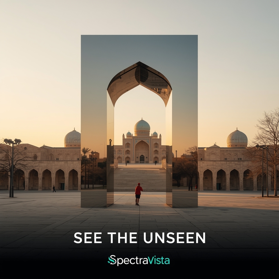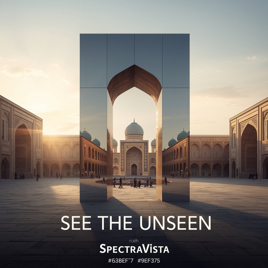 2.Leonardo.ai Промпт: cinematic art poster showing a large monolithic mirror portal placed in the plaza of Silk Road Samarkand, surrounded by modern architecture and soft golden evening light. The mirror behaves like a reflective portal — not transparent. In the mirror reflection appears the ancient Registan of Samarkand as it originally looked centuries ago, with golden mosaics, turquoise domes, and early morning light. The contrast between modern surroundings and the historical reflection feels mystical and mesmerizing. Clean minimalist typography at the bottom reads «See the unseen». SpectraVista logo in gradient colors (