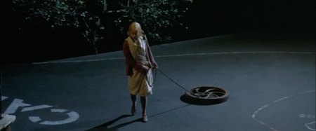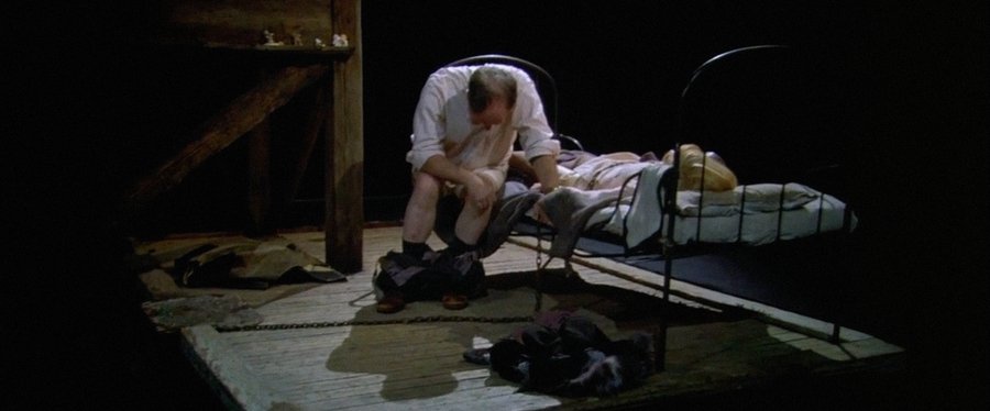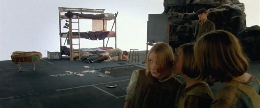 Наиболее значительная трансформация происходит в функции рассказчика. В литературном сценарии повествователь выполняет традиционную описательную роль через текстовые ремарки и пассажи. В фильме же монотонный голос Джона Хёрта становится активным драматургическим элементом. Он создает эффект брехтовского отчуждения, постоянно напоминая зрителю об условности происходящего. Этот голосовой контраст особенно важен в контексте визуального решения фильма, где условность пространства подчеркивается схематичными декорациями и рисунком собаки вместо реального животного.