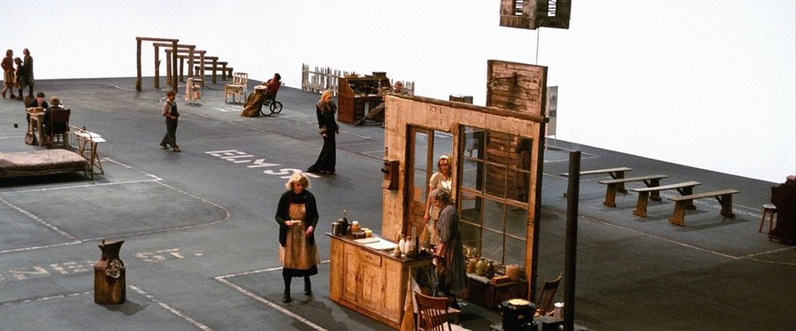 Этот подход можно считать творческим развитием идей Dogme 95. Вместо следования букве манифеста, требующей съемок на натуре и естественного освещения, фон Триер создает искусственное пространство с меловыми контурами домов на черном полу, где нет стен, а актеры притворяются, что открывают несуществующие двери. Такой утрированный минимализм служит той же цели, что и исходный «обет целомудрия». Он обнажает условность кинематографического языка, заставляя зрителя сосредоточиться не на правдоподобии обстановки, а на моральной и философской сути происходящего.
