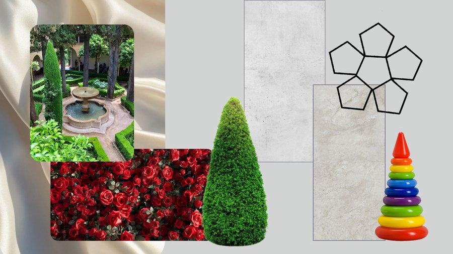 Сад расположен в контексте архитектурного здания Торгового центра «Алтын Асыр», прозванный «Пятиножкой». Ашхабада. Концепция сада строится как органичное продолжение архитектурного пространства, усиливая визуальную и функциональную связь между зданием и природой. Основой послужили принципы и эстетика работ Элизабет Диллер — минималистичность, упор на чистые геометрические формы и взаимодействие с окружающей средой.