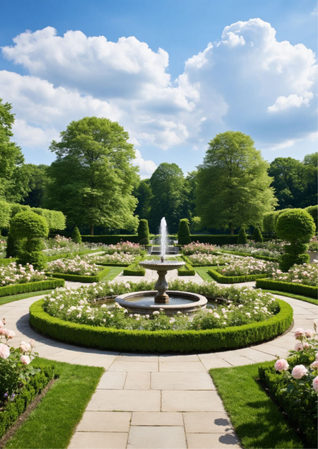 Сад продолжая архитектуру состоит из трех частей, каждая из которых имеет форму трапеции.