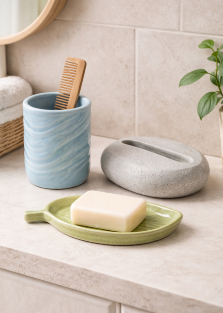 — тип: переработанный пластик (recycled PLA или recycled PETG) — цвет: однотонный для каждого объекта (мыльница: зелёный, подставка для зубных щеток: коричневый, подставка под бритву: серый, стакан: голубой, тарелочка: розовый) — фактура: матовая, с лёгкой зернистостью и допустимыми вкраплениями, характерными для переработанного пластика — материал должен быть влагостойким, подходящим для использования в ванной комнате