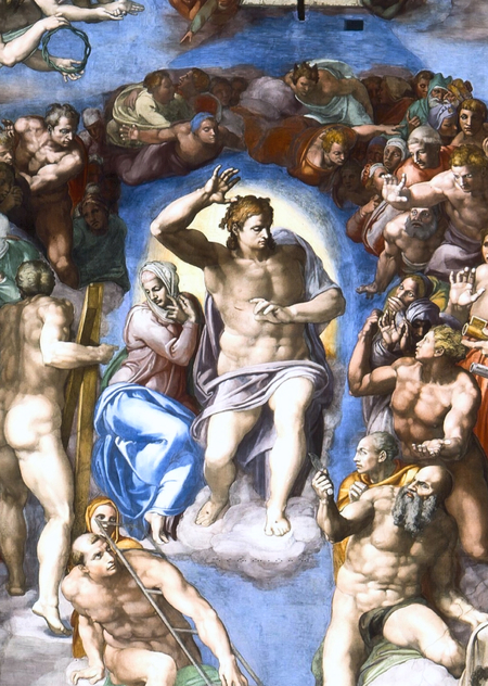 У Микеланджело Христос занимает центр фрески «Страшный суд» в Сикстинской капелле и изображён в момент решающего жеста. Его поднятая правая рука — это не благословение, а жест приговора. Тело Христа атлетически вылеплено, напряжено, он словно совершает вращательное движение. Лицо выражает суровость и решимость. Этот Христос — активный судия, динамическая сила, запускающая всё движение вокруг.