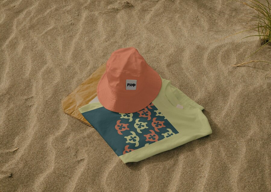 Apparel mockup on a sandy beach, mimicking the style of the «РИФ студия преображения черепах» merchandise. Key features: Top-down shot of sand, with a crumpled light brown towel as a base. A t-shirt and a bucket hat are arranged on top, slightly overlapping. A few blades of beach grass are visible near the top right corner. Soft, natural lighting. Solid coral/peachy-orange color. A small, white square patch with the text «РИФ» (in black) is centered on the front of the hat. The hat is slightly crumpled and casts a soft shadow. Pale yellow/light olive green. Has a rectangular print in the bottom left corner. The print features: Background: Muted teal color. Repeating stylized turtles in burnt orange and pale yellow, arranged in a grid. The turtle icons are simple, Detailed texture of sand, with varying shades of brown and beige. Fine grains are visible. Soft shadows emphasize the contours of the sand. Natural, beachy, minimalist, and slightly retro. The colors are muted and harmonious. The focus is on the apparel and the beach setting.