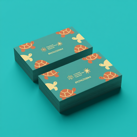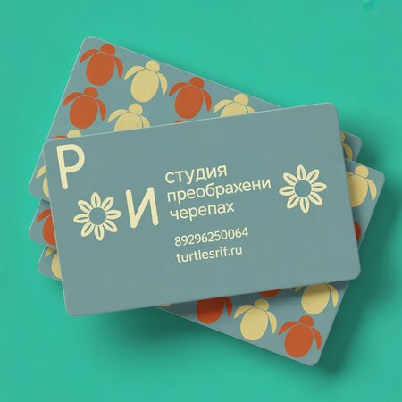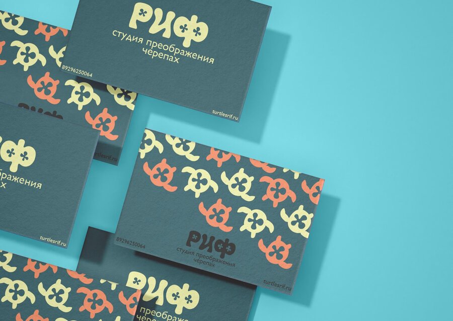 Business card mockup, echoing the design of the «РИФ студия преображения черепах» business card. Key features: Rectangular, standard business card size. Multiple cards arranged in a slightly overlapping, angled stack to show depth. Bright teal background. Muted teal (card background), burnt orange and pale yellow (turtle pattern and text). Repeating pattern of stylized turtles in burnt orange and pale yellow, covering the upper portion of some cards and the lower portion of others. The turtle icons are simple, almost geometric. Text includes: «РИФ студия преображения черепах», «89296250064», «turtlesrif.ru». The word «РИФ» is stylized with two symbols resembling flowers or suns on either side. Slightly textured card stock to simulate paper grain. Matte finish. Add subtle shadows to indicate depth and dimensionality. Clean, minimalist, modern, playful, professional. The cards appear to be printed on high-quality card stock. The background color of the full scene is a bright teal.