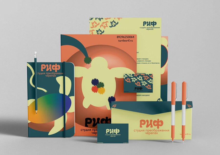 Professional branding mockup, clean minimalist design, echoing the style of «РИФ студия преображения черепах», featuring: Predominantly muted teal, burnt orange, pale yellow, with accents of dark green, navy blue, red, and gold. Simple, geometric, organic shapes, turtles, stylized curves, sun. Avoid sharp corners, embrace rounded forms. A slightly textured, matte surface. Simulate a paper-like or subtle grain. Clean lines, geometric layout, layered elements, mockup elements placed to emulate flat lay photograpy. Text «РИФ» Modern, playful, professional, branding mockup of stationery in a flat lay style