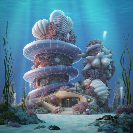 futuristic underwater building made of corals and seashells, inspired by bio-architecture and marine organisms, smooth spiral and spherical shapes, translucent glass-like coral textures, pearly seashell surfaces, large spiral tower with interconnected domes, organic design integrated into the seabed, surrounded by seaweed, rocks, and turtles, glowing underwater light beams, calm and mysterious atmosphere, ocean blue and violet tones, highly detailed, cinematic lighting, ultra realistic, 3D render style, concept art