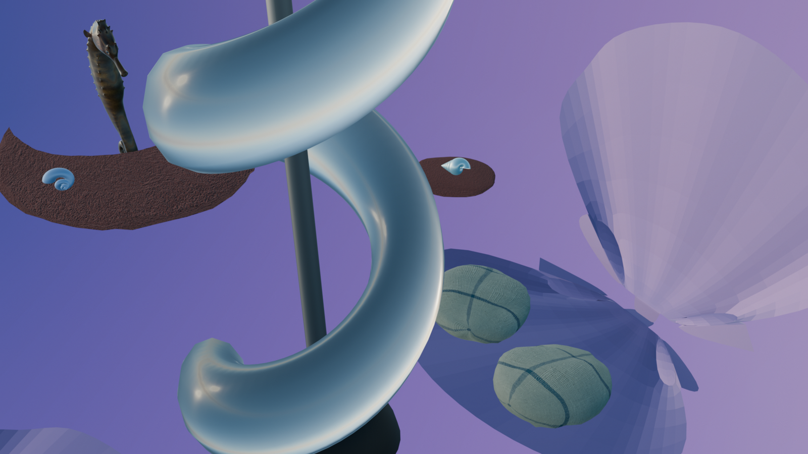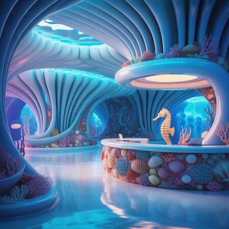 futuristic underwater interior made of corals and seashells, inspired by marine bio-architecture, smooth spiral and shell-like shapes, translucent pearl materials, glowing blue and violet ambient light, curved organic walls, floating coral furniture, reception area made of seashells and coral textures, behind the counter stands a seahorse receptionist, calm and surreal underwater atmosphere, soft lighting, highly detailed, ultra realistic 3D render, cinematic concept art