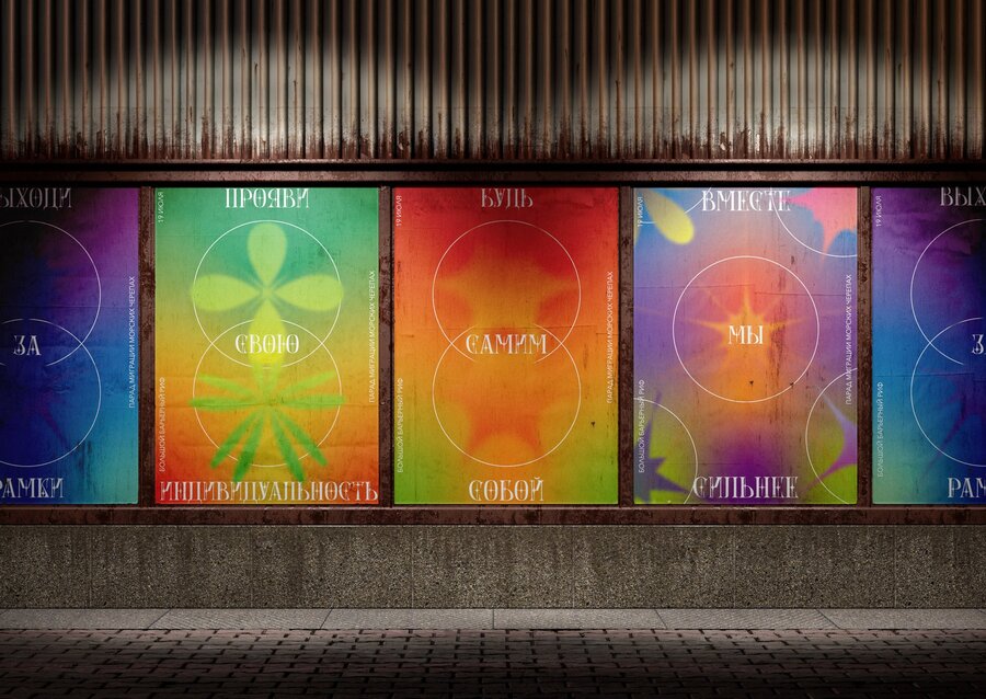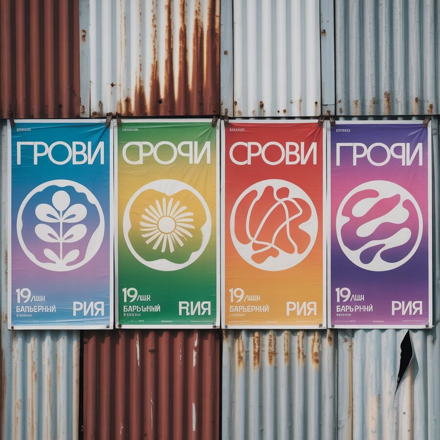 Four posters affixed to a weathered corrugated metal wall, echoing the design style of the «ПАРАД МИГРАЦИИ МОРСКИХ ЧЕРЕПАХ» posters. Key features of the posters: Vertical posters, all approximately the same size. Arrangement is side-by-side in a straight row. Gradient color blends spanning warm and cool tones (e.g., blues to purples, greens to oranges, reds to yellows). Gradients should have a soft, airbrushed quality. White outlines circles, semi-transparent white shapes, some resembling flowers or starfish, similar to a stencil style. Thin, sans-serif typeface in white. Cyrillic text in a mix of uppercase and lowercase. Text elements include a title (e.g., «ПРОЯВИ»), a subtitle centered within the circles (e.g., «СВОЮ»), and side text reading «19 ИЮЛЯ» (date) and «БОЛЬШОЙ БАРЬЕРНЫЙ РИФ» (location). The posters should vary slightly in the following ways: Each poster has a different color gradient (e.g., one is primarily blue/purple, another green/yellow, another red/orange, another purple/pink). Ensure the color transitions are smooth and consistent with the overall style. Vary the central white shape. One should be a flower, another a sun/starfish, a third an abstract shape, and the fourth slightly different. The main words must be different on each poster. Add a small tear at one of the posters. Weathered and rusted corrugated metal. Some areas show signs of peeling paint or staining. Eye-level view of the posters on the wall. The wall fills most of the frame.Retro, minimalist, artistic, and slightly distressed. The posters have a handmade, screen-printed feel